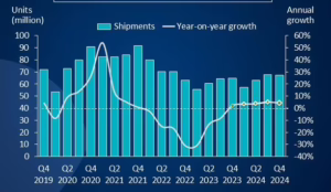 The global PC market saw modest recovery in 2024, achieving 3.8% overall growth for the year and ending with its fifth consecutive quarter of growth in Q4 (up 4.6% YoY). Total shipments reached 67.4 million units in Q4, driven primarily by a 6.2% rise in notebook shipments (53.7 million). Desktop shipments declined slightly, by 1.4%, to 13.7 million units.