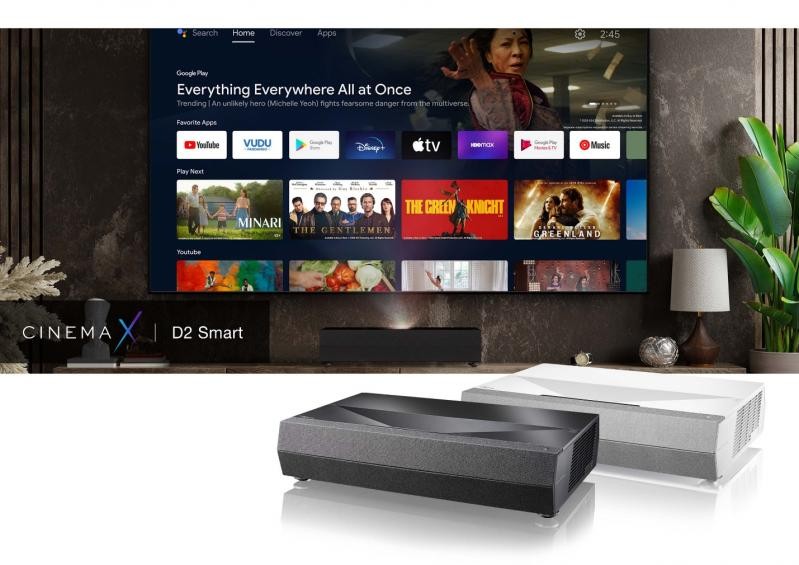 The CinemaX D2 projectors also feature 3,000 lumens, a 1,800,000:1 contrast?ratio, and HDR and HLG compatibility in a sleek, compact design, available in a black or white chassis, along with one remote control for the projector which also activates the smart apps.